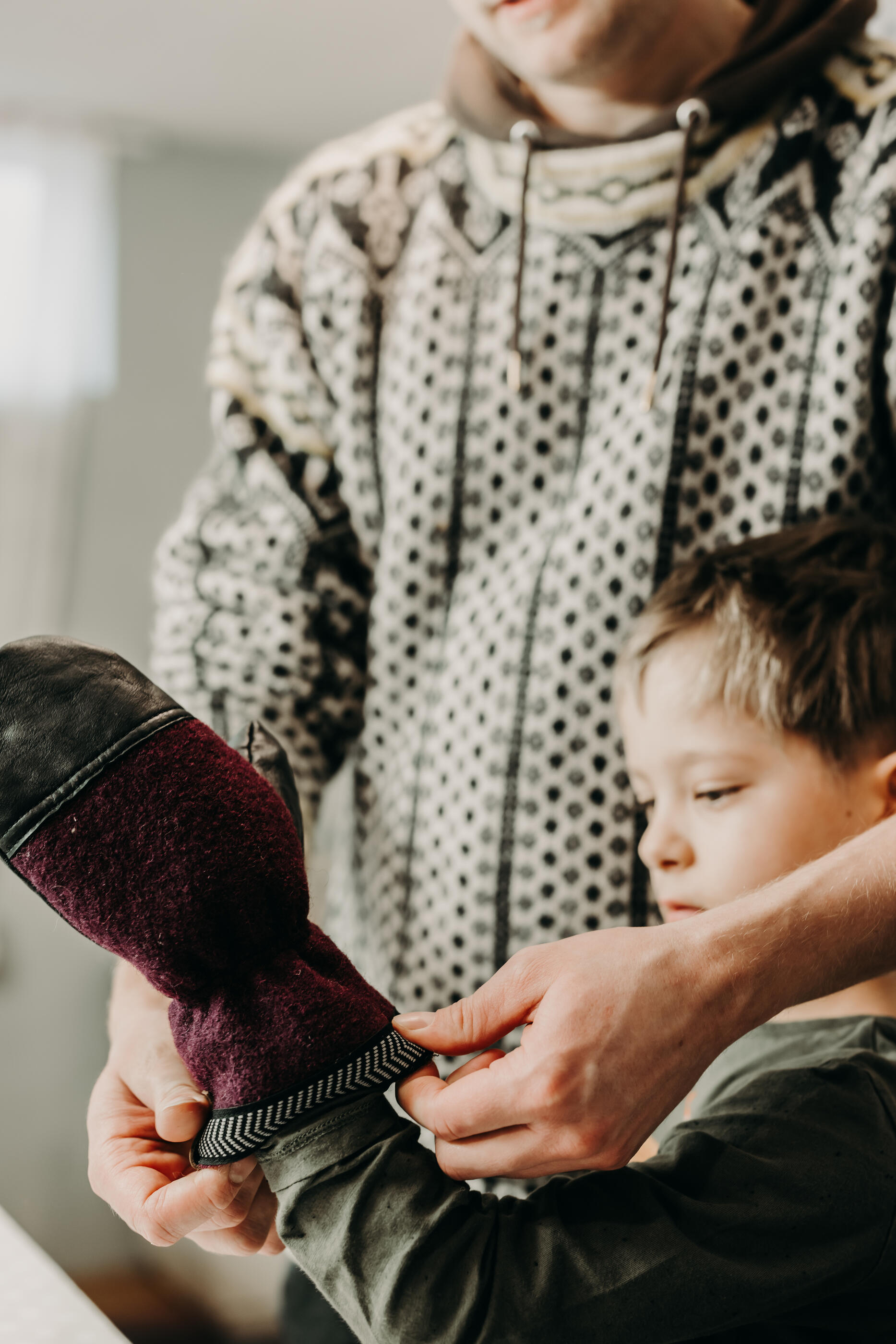 Yttervantarna sys av vegetabiliskt garvat renskinn och kokt ull som är ett stickat ylletyg som är valkat. Kokt ull har med det stickade tygets botten och den lättare valkningen mer följsamhet mot den mer traditionella vadmalen som är ett vävt valkat ylletyg. Vantarna är kantade med dekorativa reflexband.